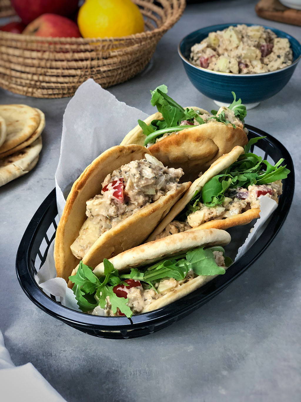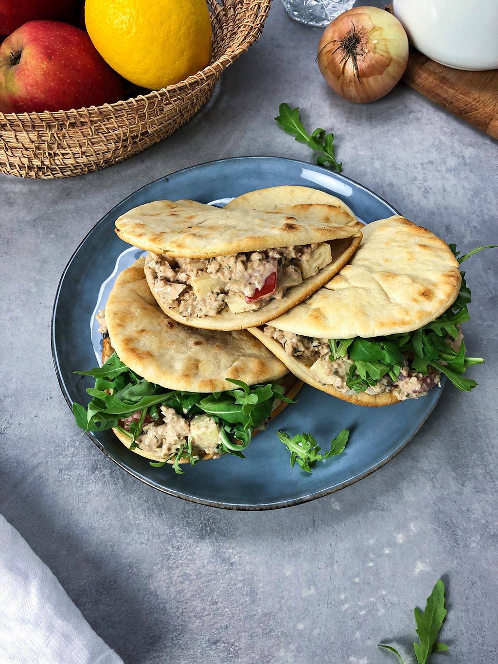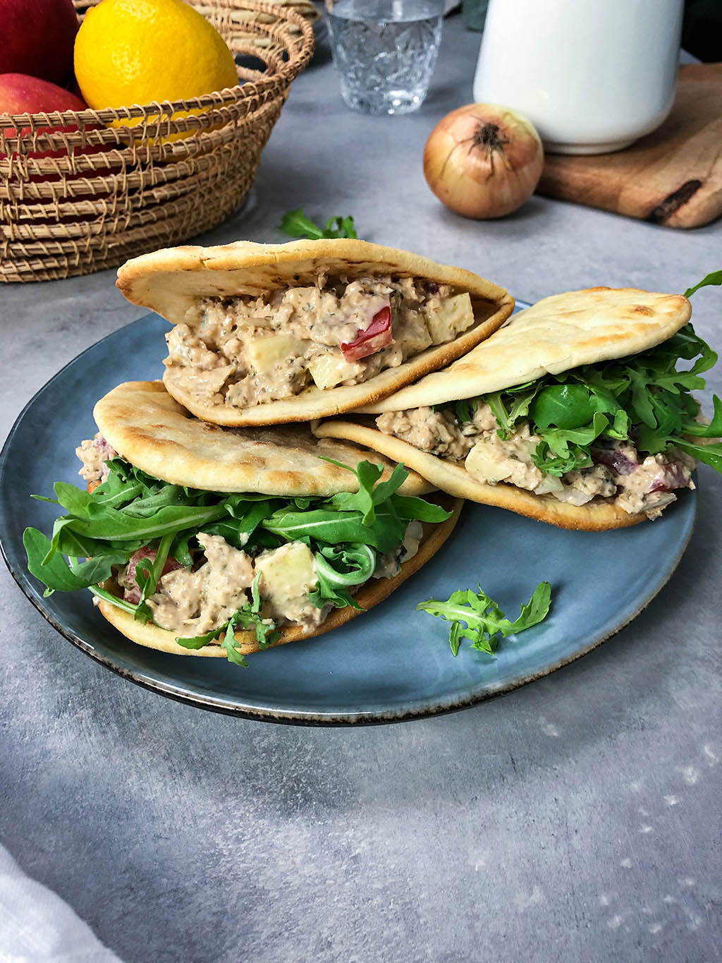 Jaren geleden, toen wij nog niet plantaardig aten, waren wij fan van het broodje tonijnsalade bij de La Place. De smeuïge tonijnsalade met stukjes ui, tomaat en appel werden op een vers broodje uit de oven gesmeerd. Hierop ging dan flink wat rucola. Deze combinatie was zo lekker dat we dachten, dit kunnen we natuurlijk ook doen met de Peas Maker Stukjes.