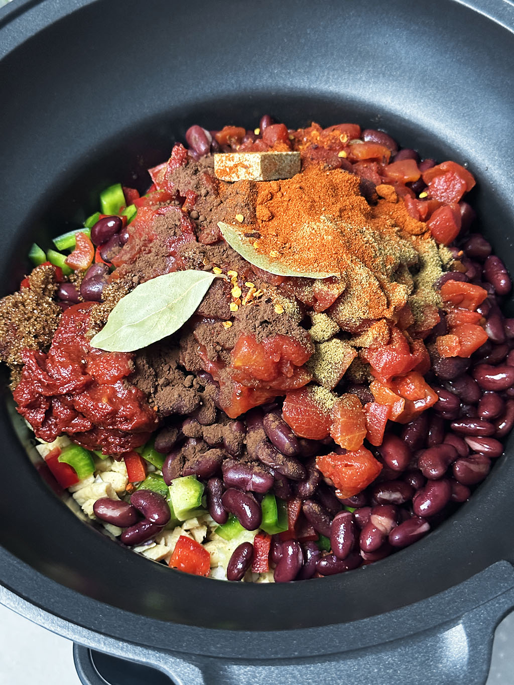 Snipper de ui, pers de knoflook en snij de groene en rode paprika in blokjes. Giet de kidneybonen af en spoel ze om. Voeg alles toe aan de slowcooker, samen met de tomatenblokjes, het water, groentebouillonblokje, de tomatenpuree, donkere basterdsuiker, cacaopoeder, gerookte paprikapoeder, laurierblaadjes, komijnpoeder en chilivlokken.