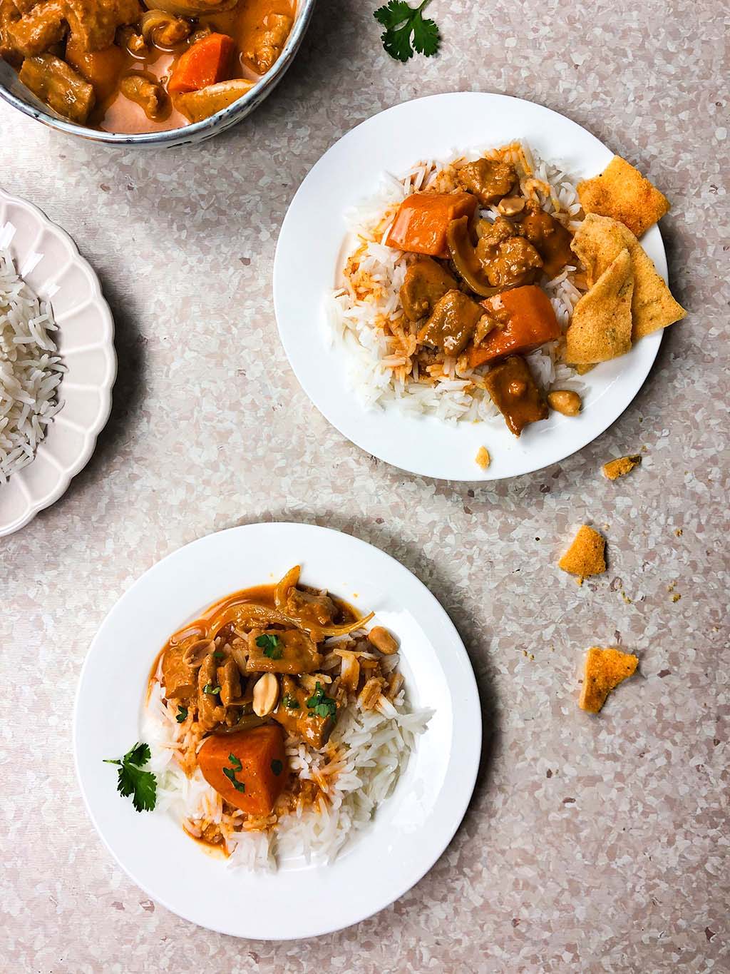 Normaal gesproken worden pinda’s meegekookt in een massaman curry. Hier kun je natuurlijk voor kiezen maar wij vonden het lekkerder om de pinda’s te gebruiken als garnering. Zo blijven de pinda’s namelijk knapperig in textuur.