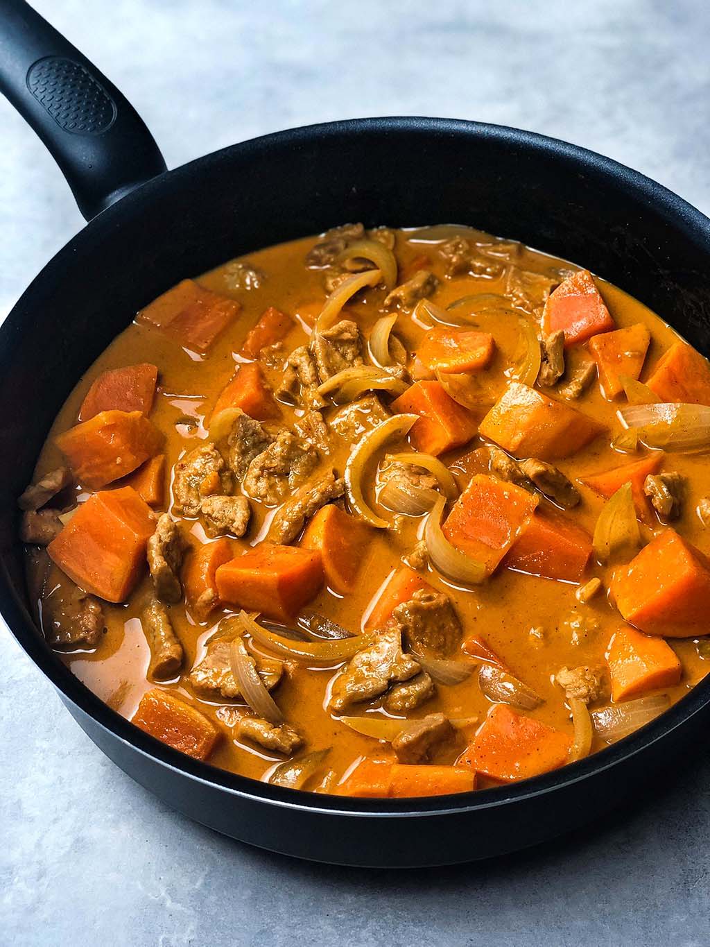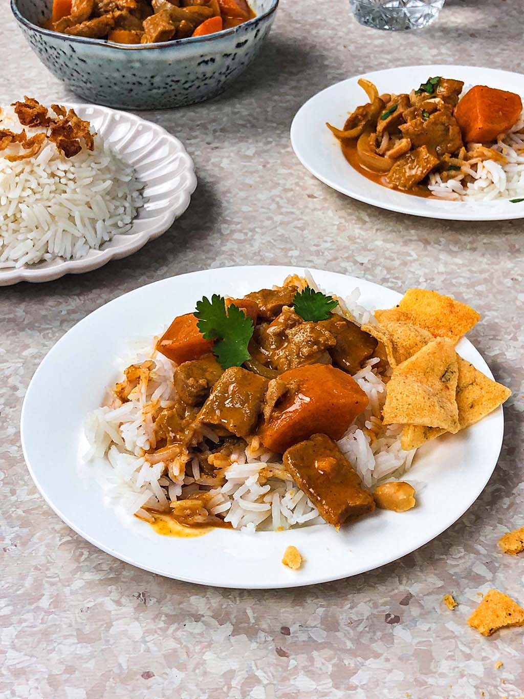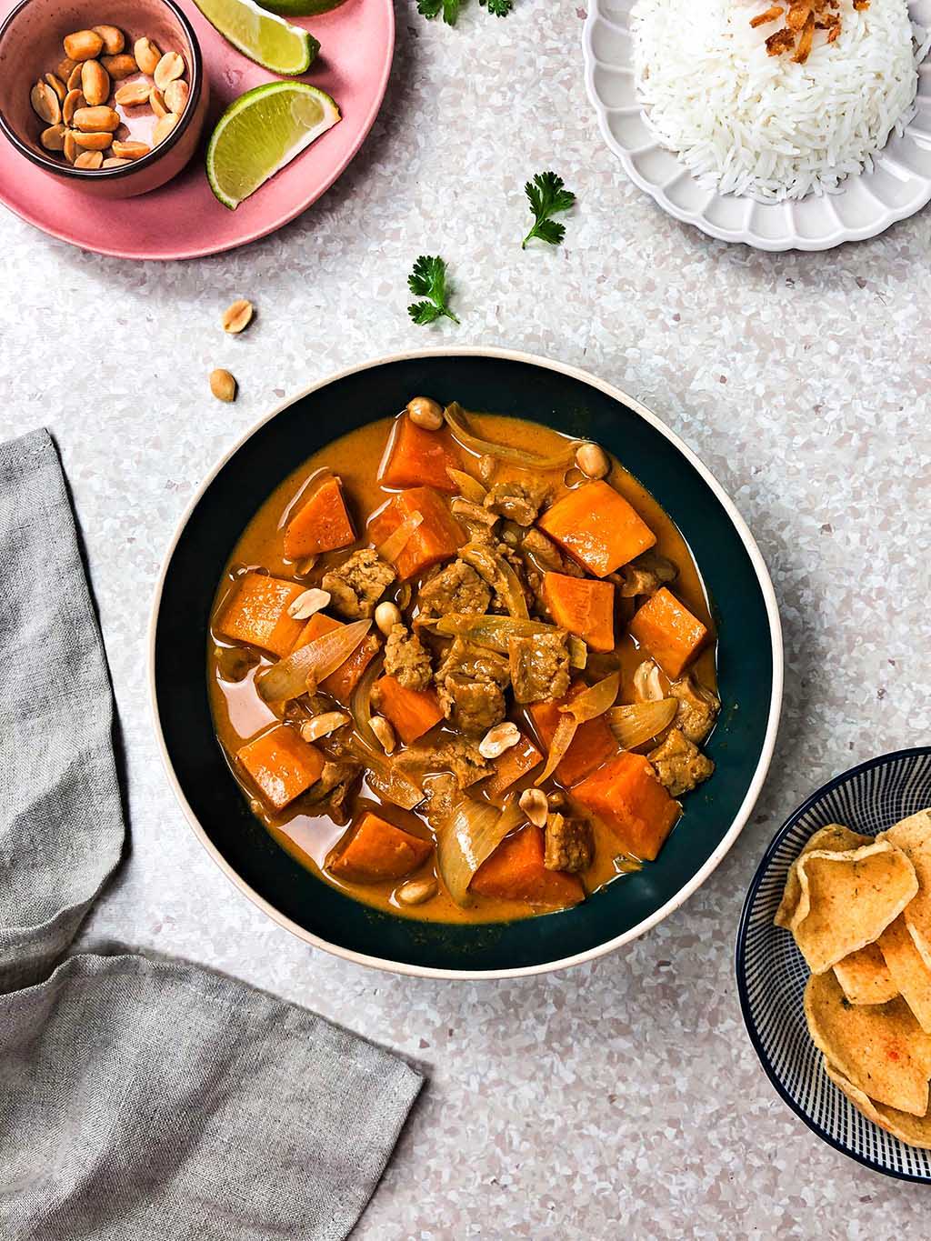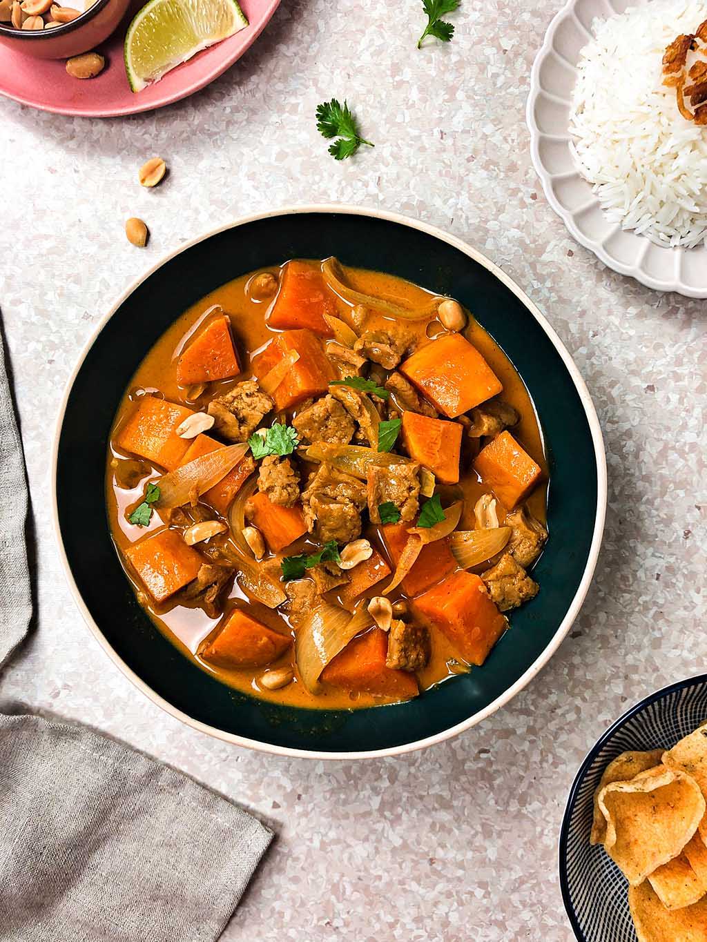 Ook hier zie je weer, hoewel het een Thaise curry is, dat deze curry is ontstaan vanuit invloeden van buitenaf. Dit vinden wij altijd leuk aan gerechten. Meestal wordt deze curry gemaakt met vlees maar wij delen graag een heerlijke vegan versie met jou.