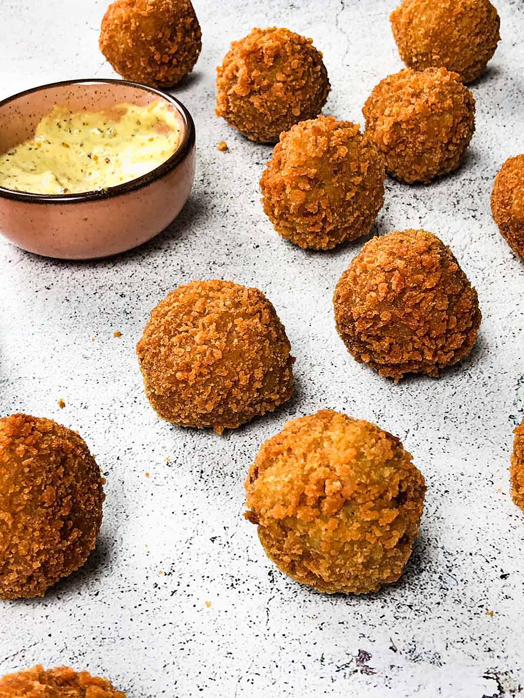 Ga je dit recept voor vegan bitterballen maken dan raden wij erg aan om de bitterballen gewoon te frituren. Wat ons betreft hoort zo een bitterbal te zijn. We hebben het uiteraard ook in de oven en de Airfryer getest maar dit was geen succes. En mocht je denken dat bitterballen uit de oven gezonder zijn, laat je dan niet misleiden. Bitterballen die je kunt afbakken in de oven schijnen meer calorieën te bevatten dan bitterballen die je moet frituren. Dit komt omdat ovenbitterballen zo gemaakt worden dat je ze niet meer hoeft te frituren. Kortom, gewoon lekker frituren. 😉