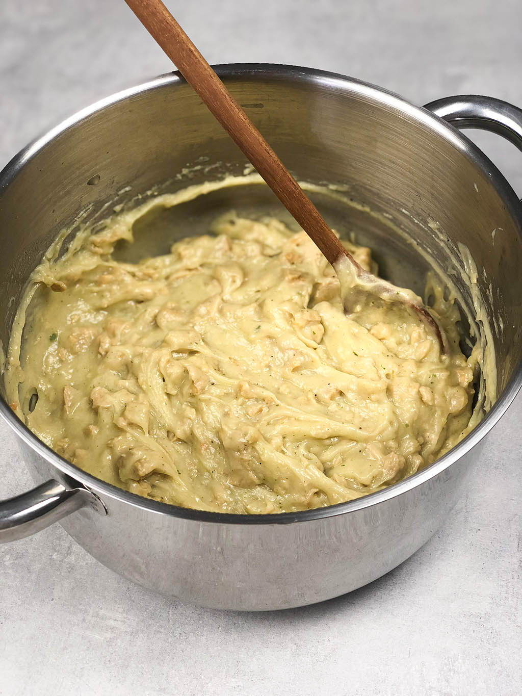 Dan maken we een simpele roux door plantaardige boter te smelten in een pan om hier vervolgens bloem aan toe te voegen. Terwijl we blijven roeren in de pan met een garde voegen we langzaam de groentebouillon toe. Vervolgens ontstaat er een smeuïge massa. Dan maken we het nog extra goed op smaak met wat zout en versgemalen zwarte peper. Vervolgens doen we de Peas Maker Stukjes erbij. Dit laten we afkoelen in een ondiepe kom. Daarna laten we het goed stijf worden in de koelkast.