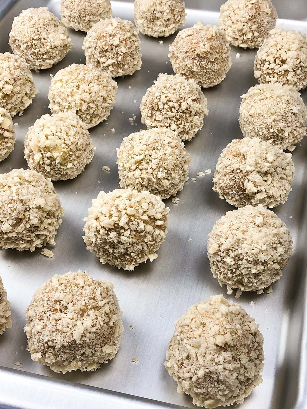 Leg nu 1 kommetje met water, 1 bord met paneermeel en 1 bord met panko klaar. Rol elke bal eerst door het paneermeel, dan door het water, weer door het paneermeel, dan weer door het water en als laatste door de panko. (Samengevat: paneermeel – water – paneermeel – water – panko.)