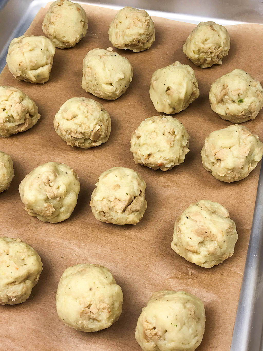 Haal de vulling uit de koelkast. Draai van de vulling 24 ballen van ongeveer 20 tot 22 gram per bal. Als het mengsel te veel blijft kleven aan je handen maak je handen dan tussendoor wat nat met water.
