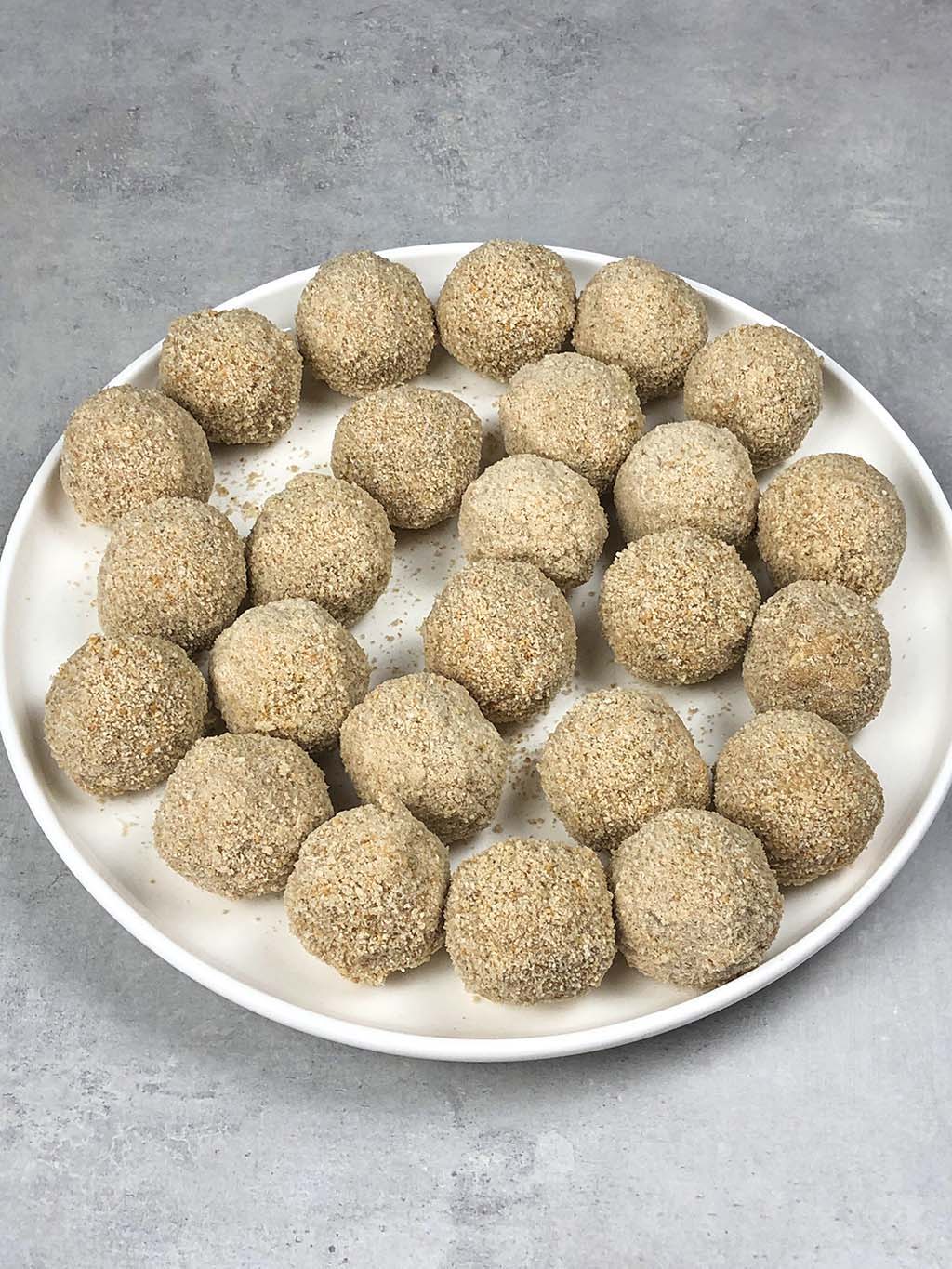 Leg een kom met koud water en een diep bord met paneermeel klaar. Rol per bal eerst door het paneermeel, dan door het water en als laatste weer door het paneermeel (samengevat: paneermeel ā water ā paneermeel).