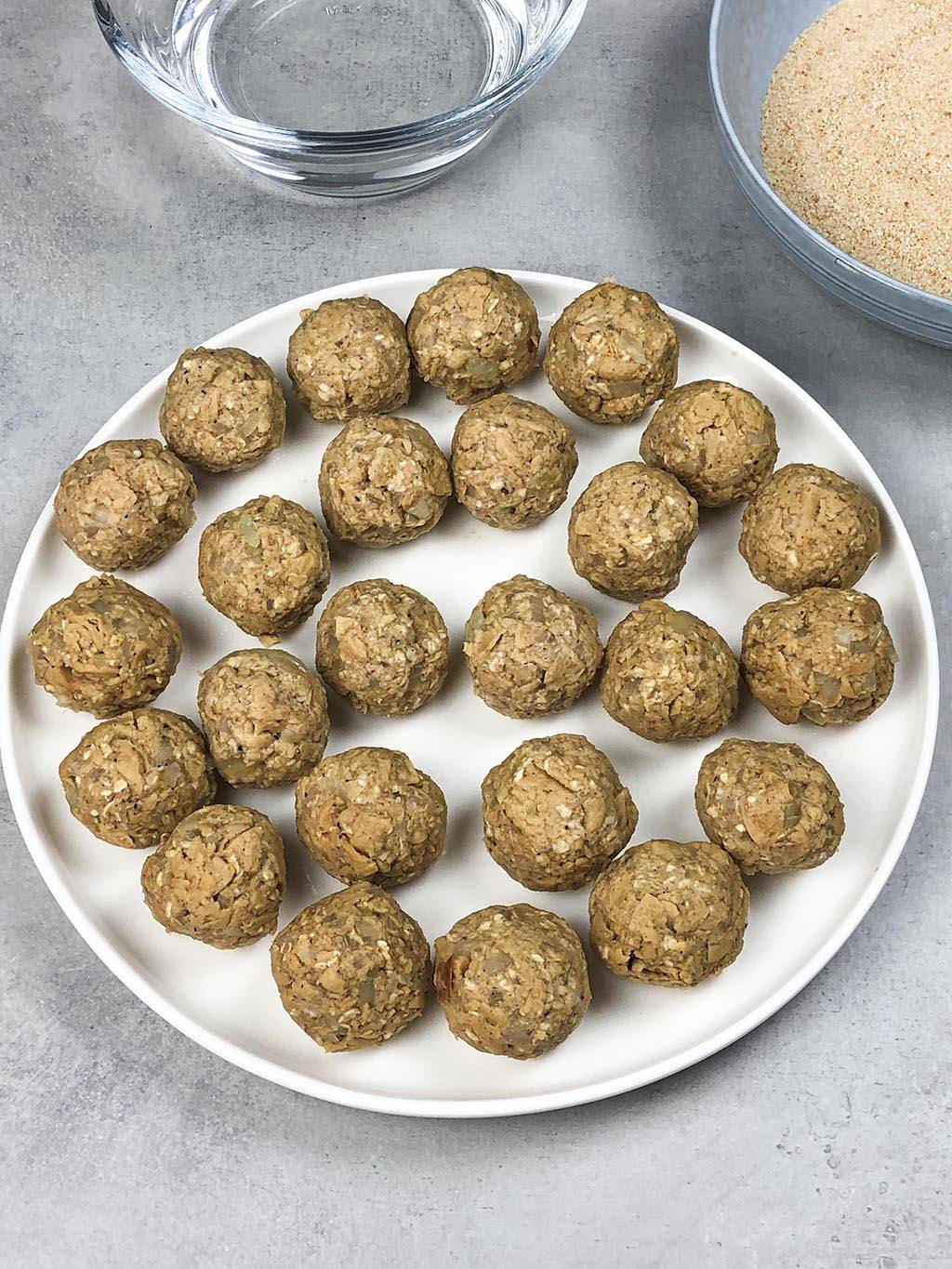 Dan draaien we 24 ballen. Alle ballen gaan eerst door hetĀ paneermeelĀ dan door het water en dan weer door het paneermeel. Dan frituren we de ballen inĀ plantaardige olieĀ tot de vegan haggisballen rondom mooi bruin worden.
