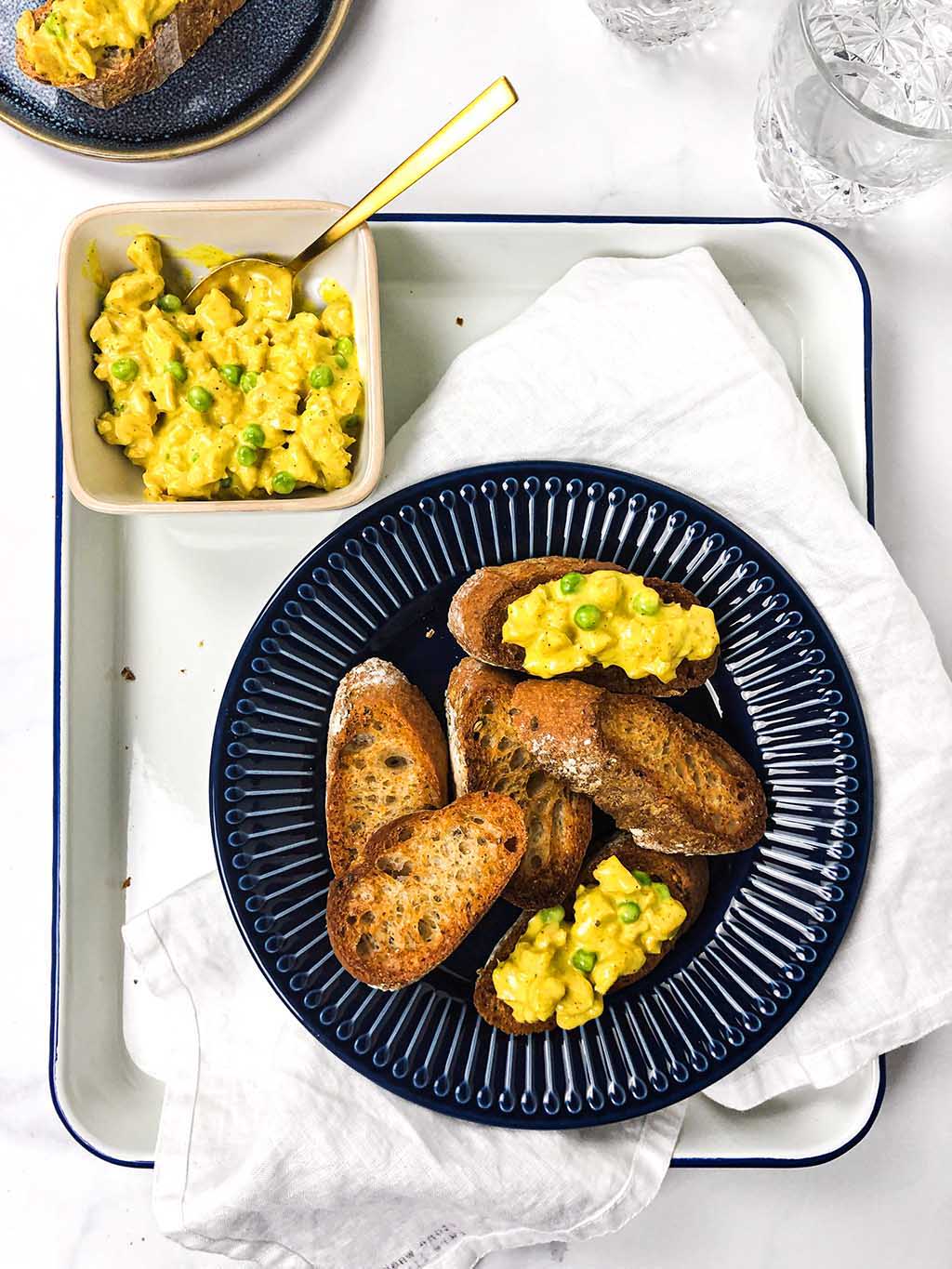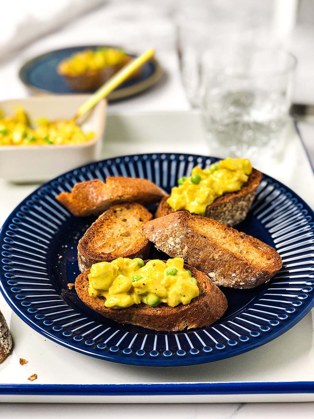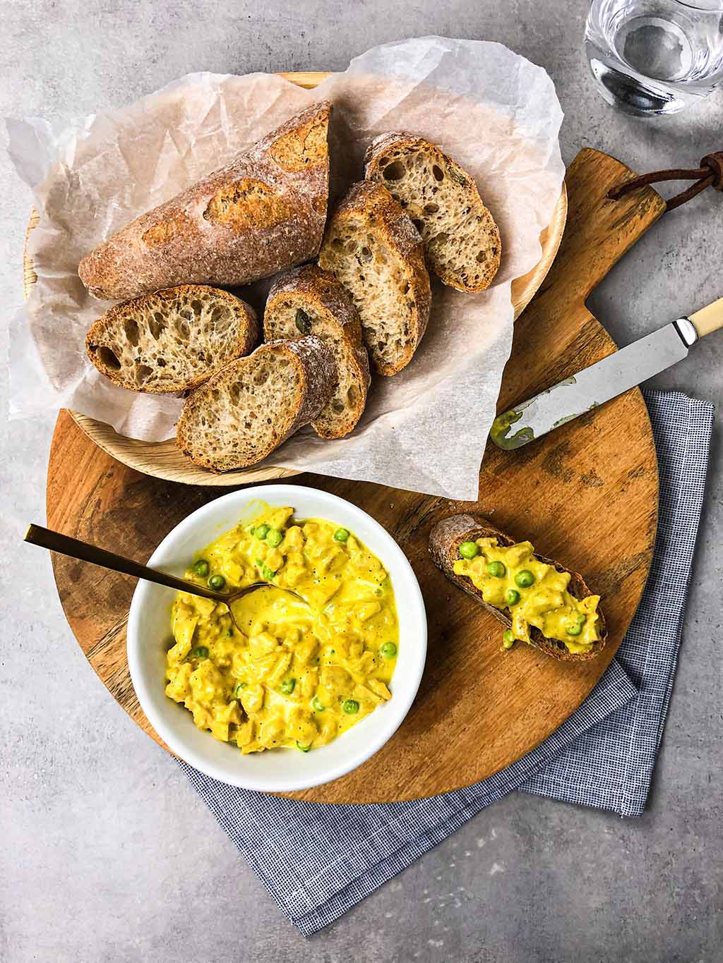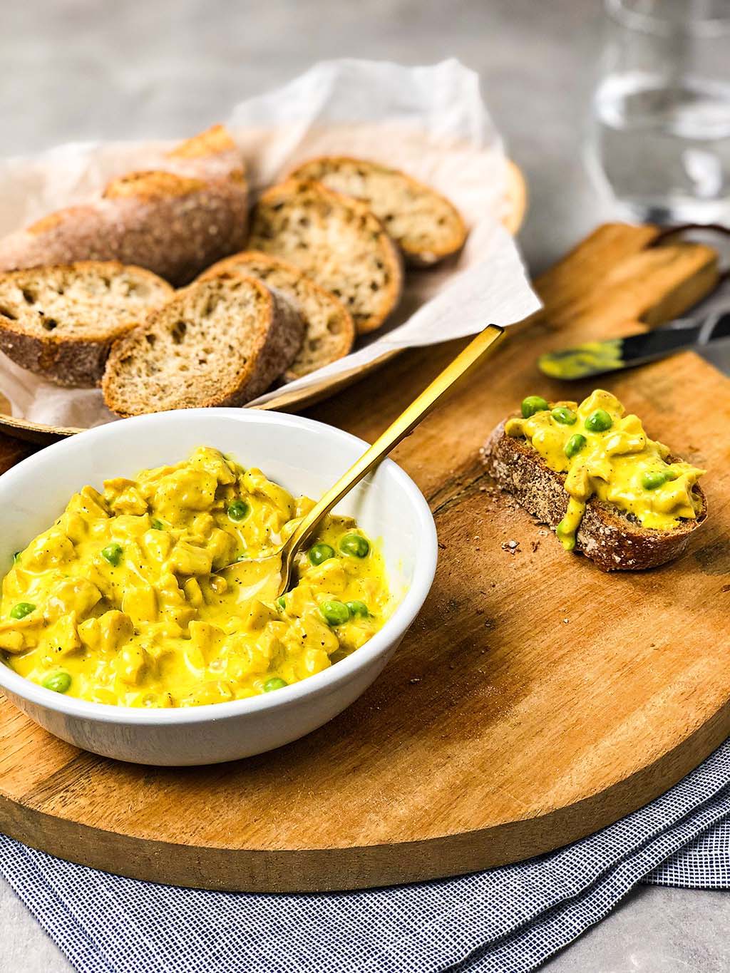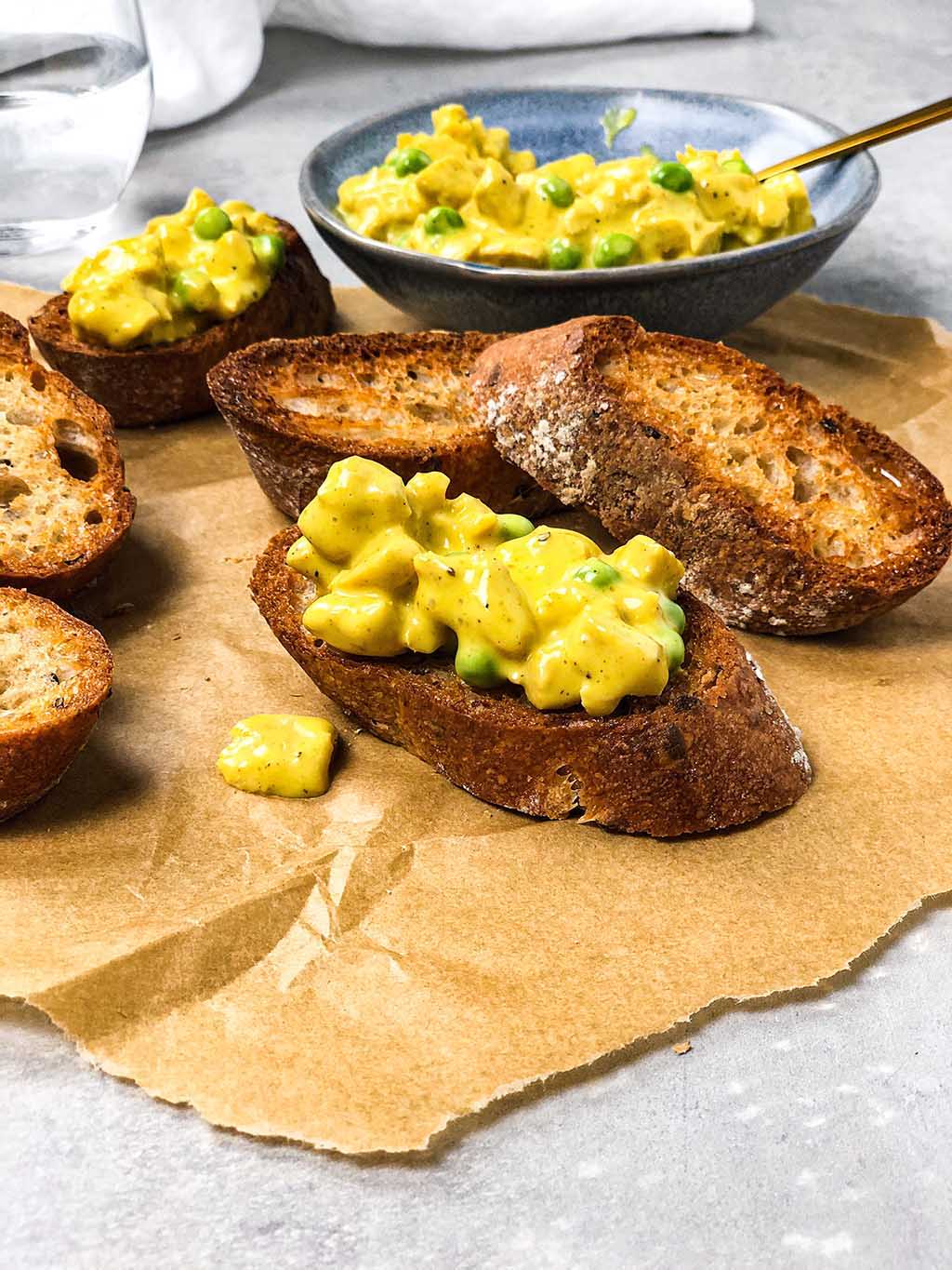 Maar wil je graag een heerlijk hapje om uit te delen? Dan kun je deze vegan kip kerrie salade ook perfect gebruiken voor op een toastje. Maar je kunt het ook serveren op een komkommer of in een witlofblaadje.
