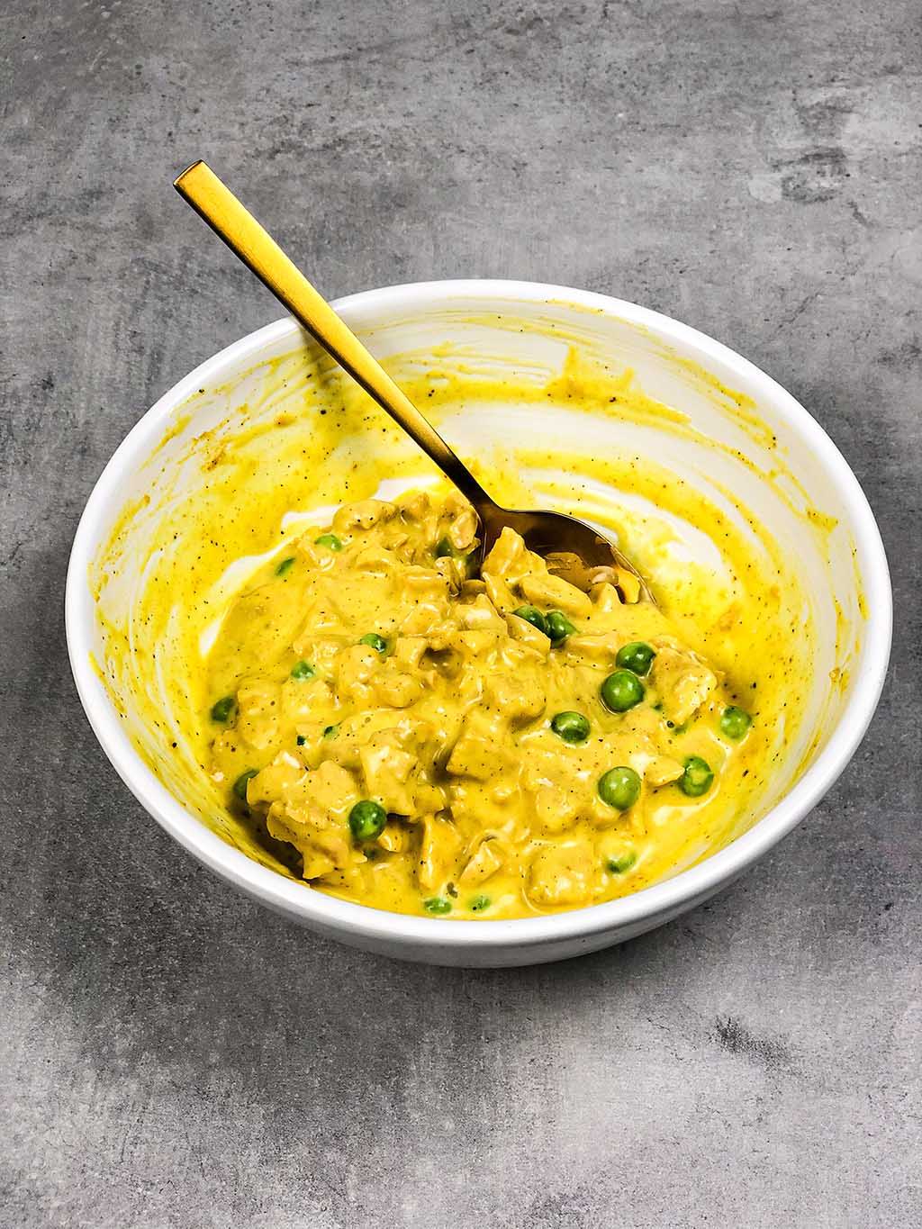 We wellen eerst de Peas Maker Stukjes in kokend water. Vervolgens gieten we ze af om ze daarna in kleinere stukjes te hakken. Dan doen we de gehakte stukjes in een kom samen met appelazijn, ahornsiroop, kerriepoeder, uienpoeder, zout en versgemalen zwarte peper. Dan roeren we alles goed door elkaar. Vervolgens gaat de vegan mayonaise, water en doperwten erbij. Roer weer even door elkaar en je bent klaar. Supermakkelijk dus!