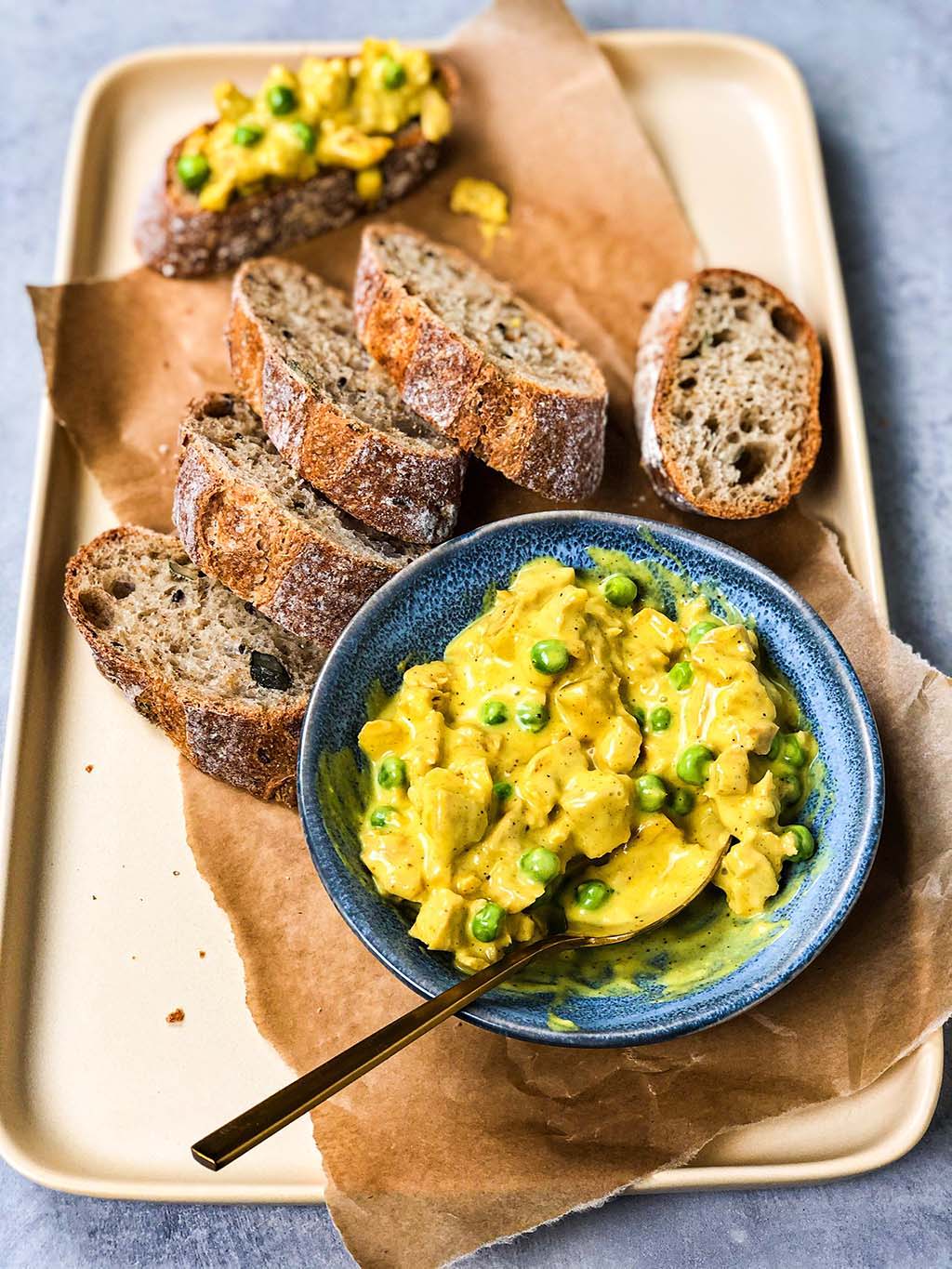 Vegan kip kerrie salade maken is niet alleen heel makkelijk maar ook onwijs lekker. Je maakt het in maar 10 minuten met maar een paar ingrediënten. Het recept voor deze romige en frisse vegan kip kerrie salade heeft een heerlijke balans tussen zoet, zout en zuur. Wij vinden het lekker om er nog extra doperwten aan toe te voegen. Dit ziet er niet alleen heel leuk uit tegen de gele kleur maar werkt ook perfect in deze vegan kip kerrie salade. Natuurlijk kun je er je eigen draai aan geven.