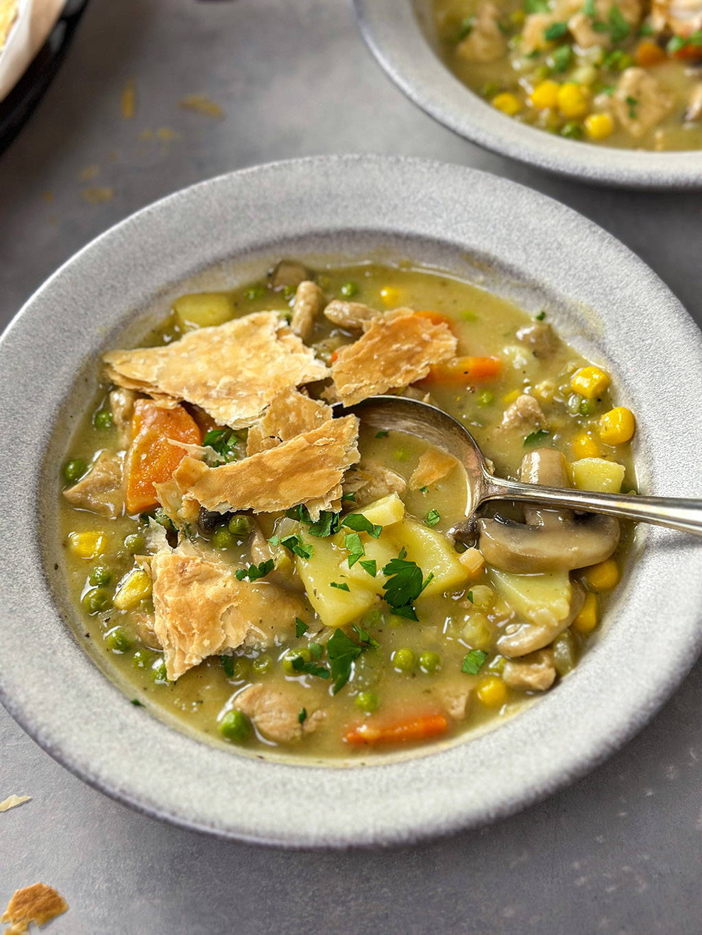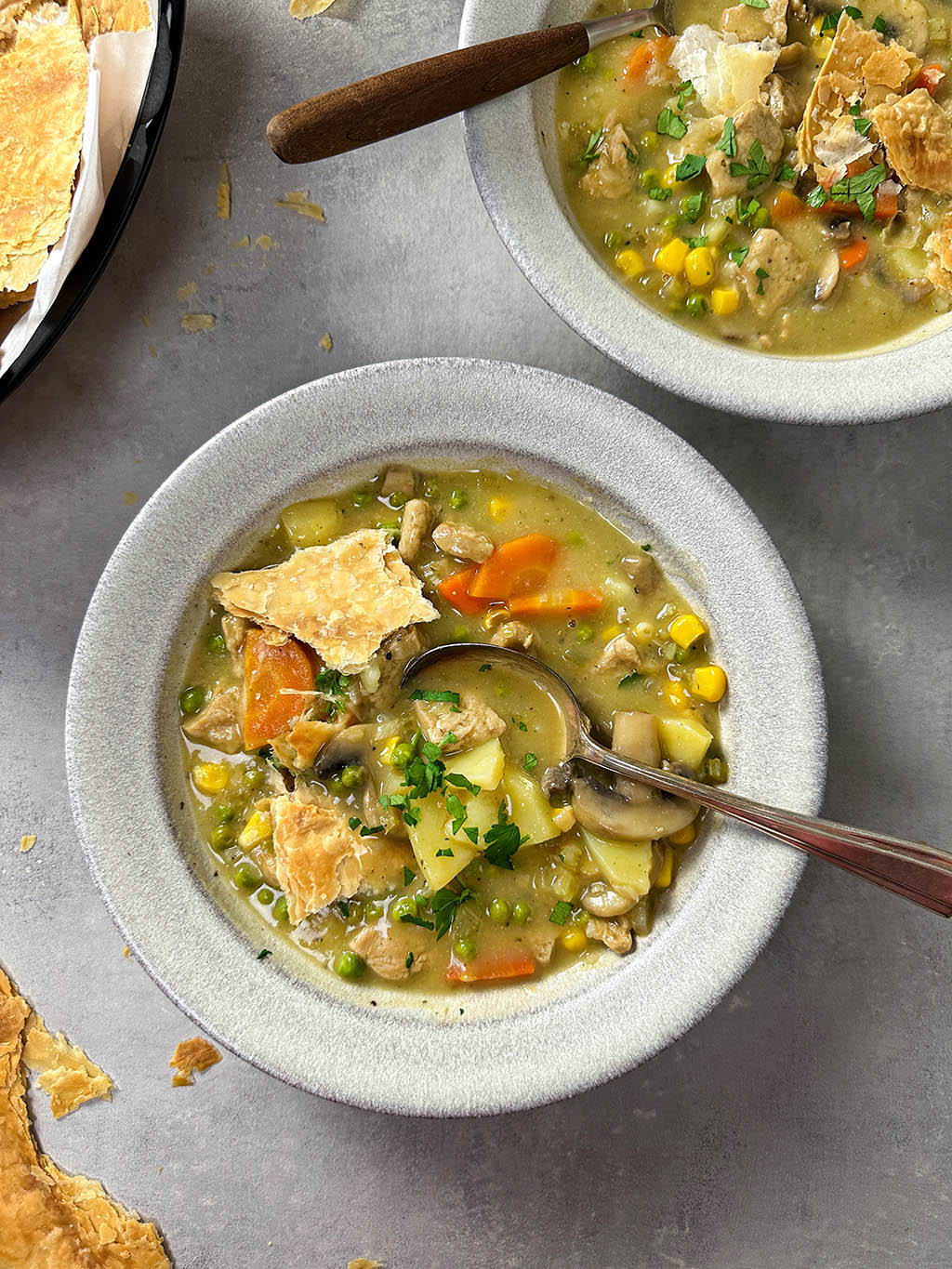 De Peas Maker Stukjes zijn niet alleen een goede bron van eiwitten maar ook een heerlijke vulling voor in deze soep. De combinatie van de romige vegan kippensoep met de krokante bladerdeeg stukken zijn een match made in heaven.