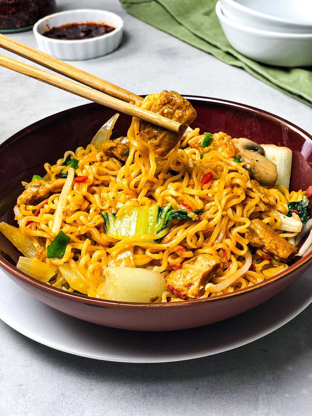 Tegenwoordig hebben veel straatkraampjes in Azië gerechten met ramennoedels. En, deze ramennoedels komen ook gewoon uit die pakjes voor 1 portie. Je hoeft er alleen maar gekookt water op te gieten, 3 minuten te laten wellen en je bent klaar. Hier in Nederland liggen ze ook in verschillende supermarkten en toko’s. Vaak zit er dan ook nog een zakje met een smaakmaker aan toegevoegd. De straatkraampjes in Azië gebruiken alles wat er in het zakje zit en hierop bedenken ze een gerecht waar ze eigen ingrediënten aan toevoegen. Deze ingrediënten variëren van vis tot vlees tot tofu en groenten. Het is dan ook mogelijk om deze gerechten vegetarisch of dus vegan te bestellen.