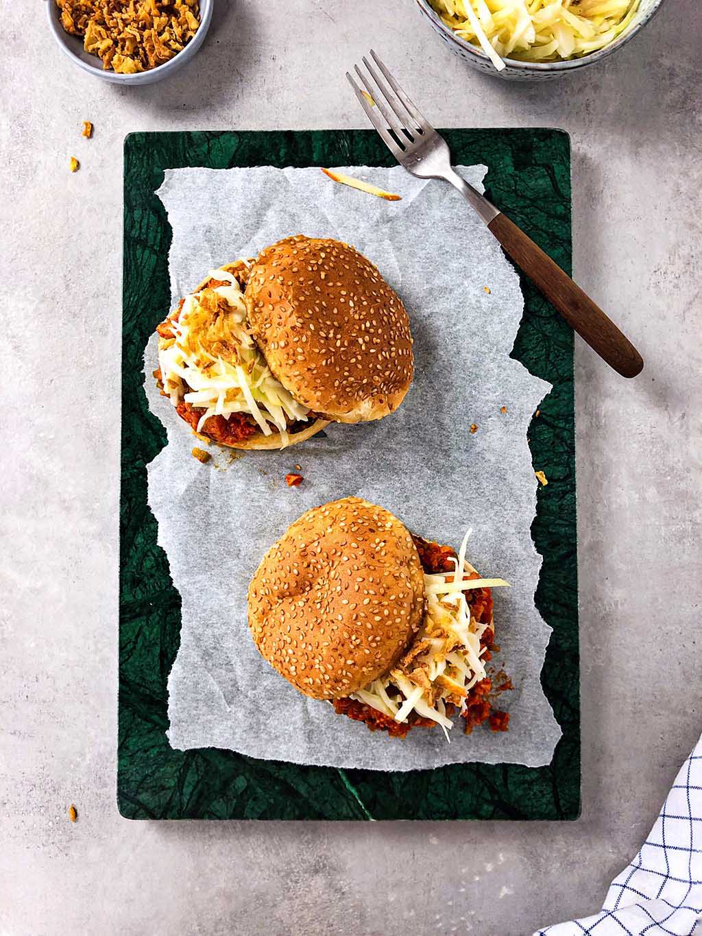 Verdeel vervolgens de vegan gehaktsaus over de zachte hamburgerbroodjes, dan wat vegan witte koolsalade en sluit af met de gebakken uitjes.