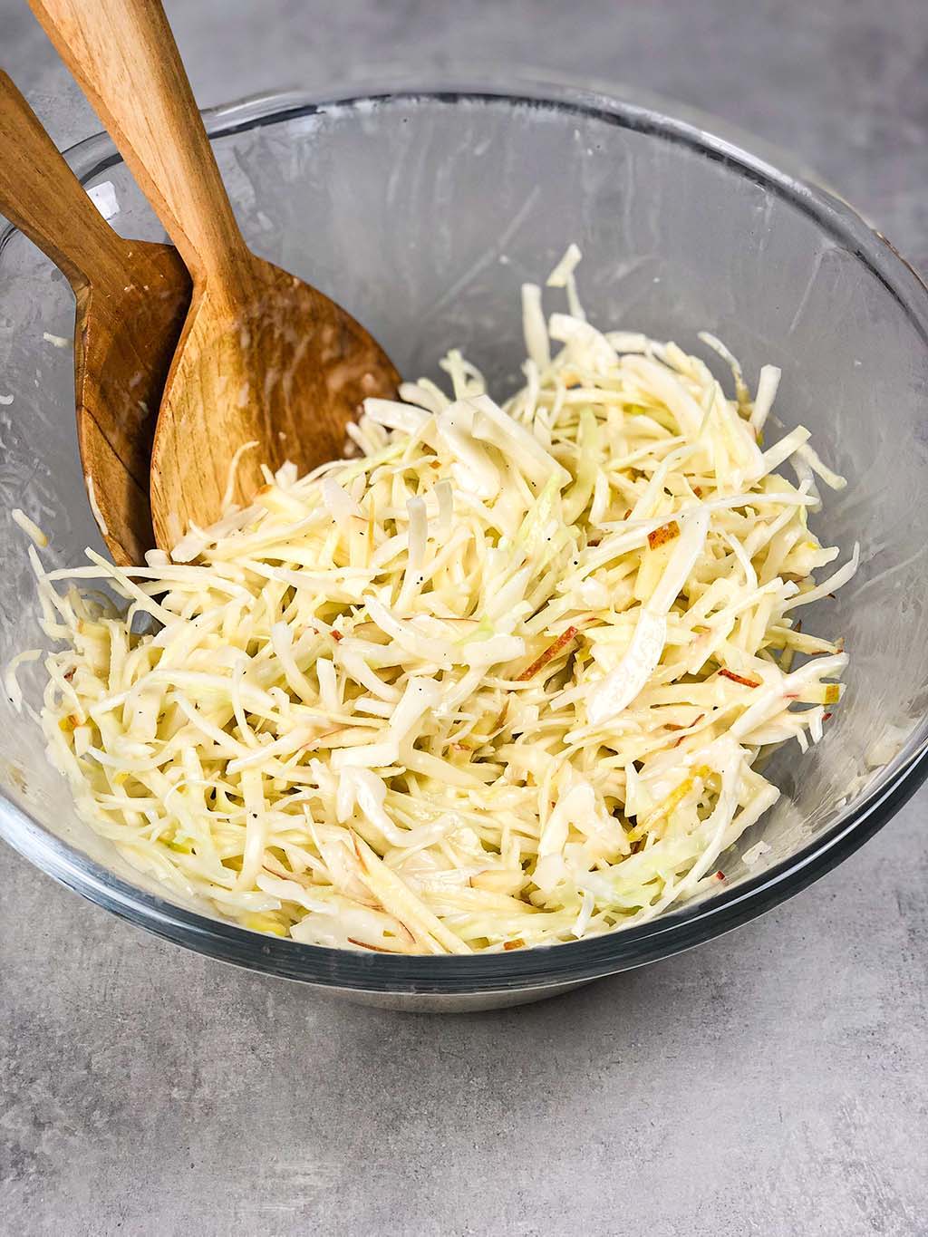 Snij de witte kool en de appel in hele dunne reepjes. Doe alles in een kom en voeg hier de plantaardige yoghurt, vegan mayonaise, appelazijn, ahornsiroop, het zout en de zwarte peper aan toe. Meng alles goed door elkaar.
